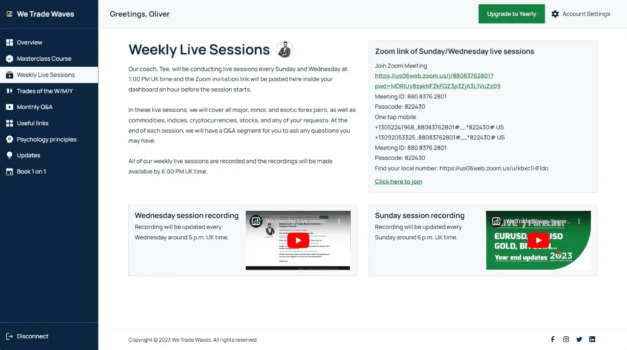 Our live Zoom sessions, led by Coach Tee, are scheduled every Sunday at 12:00 PM UK time, with the invitation link made available on your dashboard an hour prior and inside the Discord Community. Additionally, on Wednesdays, a pre-recorded Mid-Week review session is posted during the London trading hours to help you strategize for the upcoming trading days.